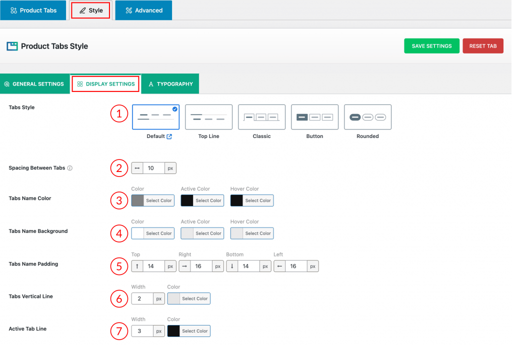 1) Tabs Style: Choose the visual design (Default, Top Line, Classic, Button, or Rounded) for the navigation tabs.