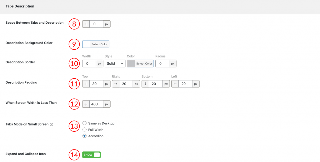 8) Space Between Tabs and Description: Controls the vertical distance in pixels (px) between the tab navigation area and the description content.