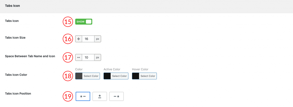 16) Tabs Icon Size: Set the size of the icons in pixels (px).