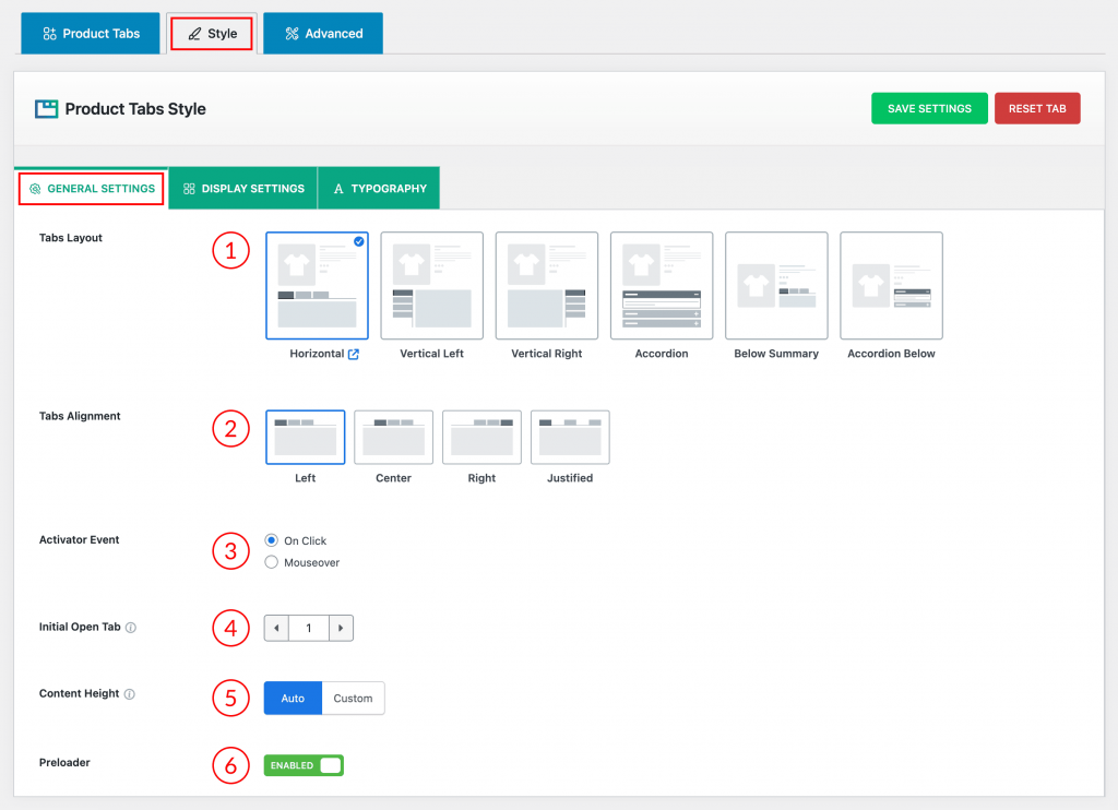 5) Content Height: Controls how the height of the tab content is handled—auto height, fixed height, or equal height for all.