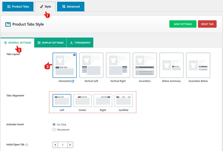 - Choose your desired Tab Layouts (Horizontal, Vertical, Accordion), then customize the position, alignment, and other settings according to your storeโs brand style.