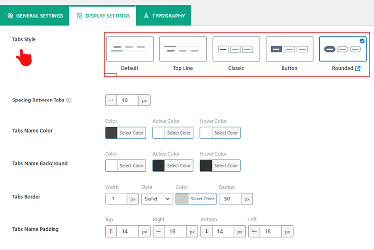 - Simply, navigate to Tab Display Settings, choose your preferred Tab Style (Classic, Line, Button, or Rounded).