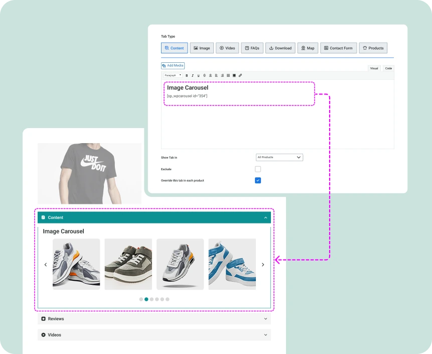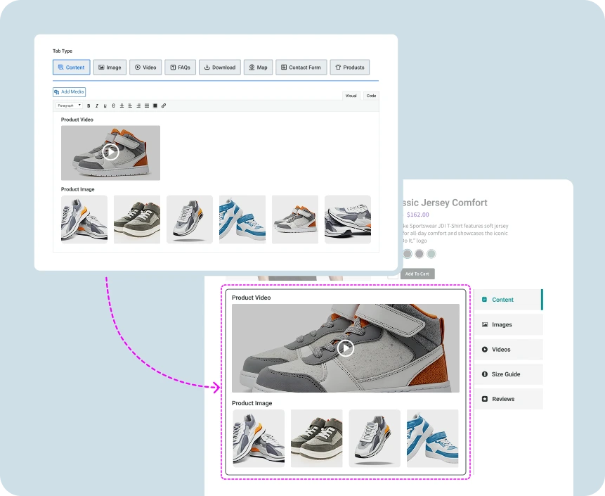 Add texts, tables, images, videos, any shortcodes, and customize with visual or code editors.