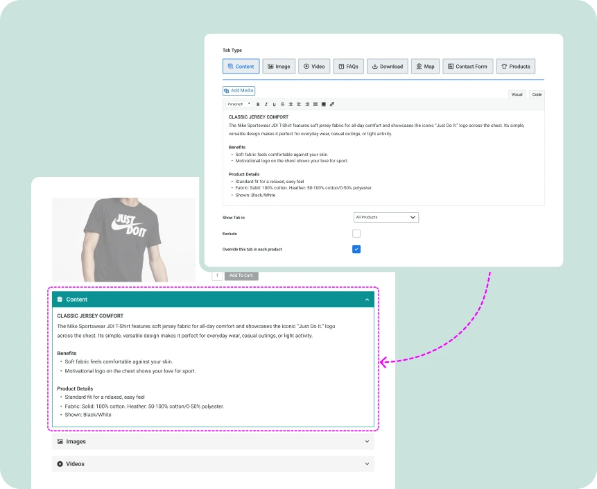 Smart Tabs WISWIG & Code editor lets you add plain text and design with custom code.