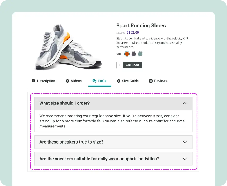Quickly answer customer questions right on WooCommerce product pages. Reduce hesitation,