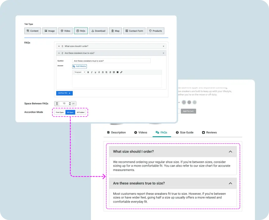 Engage shoppers with sleek, mobile-friendly accordion FAQs that expand smoothly on any device. Keep your product pages clean, fast, and easy to navigate.