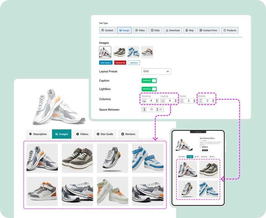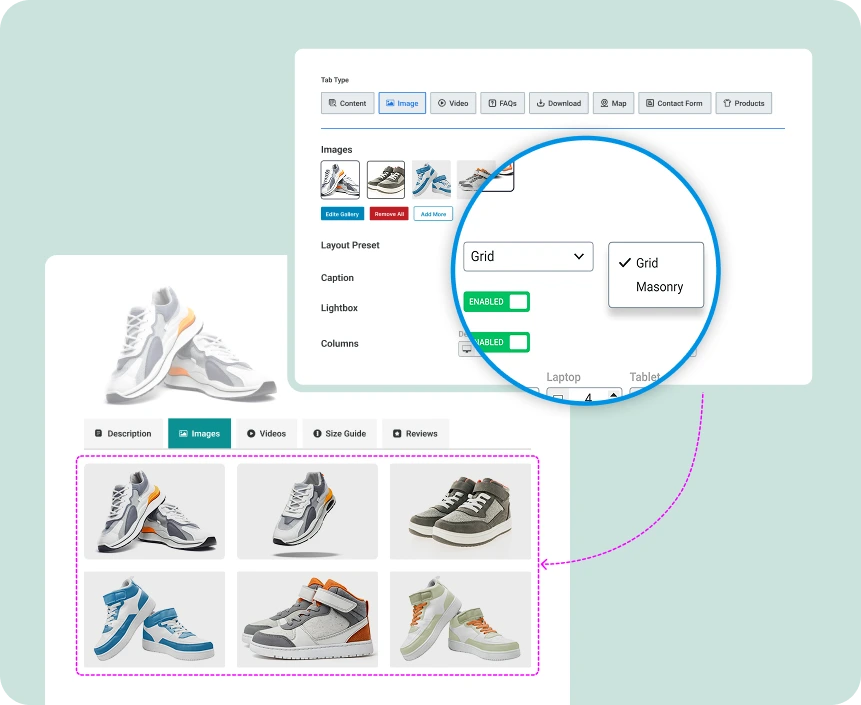 Showcase product images beautifully inside tabs with interactive